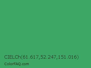 CIELCh 61.617,52.247,151.016 Color is a normal green color and the nearest color is Chateau Green #40a860. Hex code #3da866 and RGB value is rgb(61,168,102). In RGB color space, this color is composed of 24% red, 66% green, 40% blue, In CMYK color space, this color is composed of 64% cyan, 0% magenta, 39% yellow , 34% black , In HSL color space, this color has a hue angle of 143° , 47% saturation and 45% lightness.