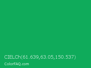 CIELCh 61.639,63.05,150.537 Color is a normal green color and the nearest color is GO Green #00ab66. Hex code #0fab5b and RGB value is rgb(15,171,91). In RGB color space, this color is composed of 6% red, 67% green, 36% blue, In CMYK color space, this color is composed of 91% cyan, 0% magenta, 47% yellow , 33% black , In HSL color space, this color has a hue angle of 149° , 84% saturation and 36% lightness.