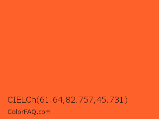 CIELCh 61.64,82.757,45.731 Color is a normal color and the nearest color is Outrageous Orange Crayola #ff6037. Hex code #ff612b and RGB value is rgb(255,97,43). In RGB color space, this color is composed of 100% red, 38% green, 17% blue, In CMYK color space, this color is composed of 0% cyan, 62% magenta, 83% yellow , 0% black , In HSL color space, this color has a hue angle of 15° , 100% saturation and 58% lightness.
