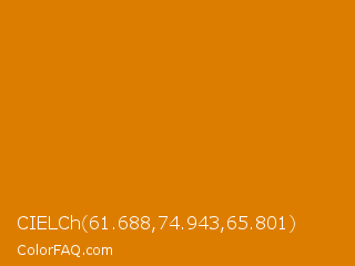 CIELCh 61.688,74.943,65.801 Color is a normal orange color and the nearest color is Fulvous #e48400. Hex code #dd7d00 and RGB value is rgb(221,125,0). In RGB color space, this color is composed of 87% red, 49% green, 0% blue, In CMYK color space, this color is composed of 0% cyan, 43% magenta, 100% yellow , 13% black , In HSL color space, this color has a hue angle of 34° , 100% saturation and 43% lightness.