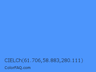 CIELCh 61.706,58.883,280.111 Color is a light blue color and the nearest color is Blueberry #4f86f7. Hex code #4c95fc and RGB value is rgb(76,149,252). In RGB color space, this color is composed of 30% red, 58% green, 99% blue, In CMYK color space, this color is composed of 70% cyan, 41% magenta, 0% yellow , 1% black , In HSL color space, this color has a hue angle of 215° , 97% saturation and 64% lightness.