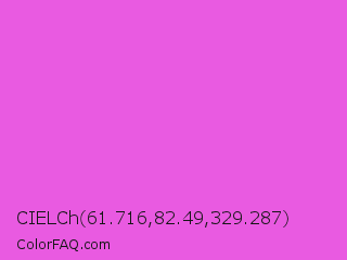 CIELCh 61.716,82.49,329.287 Color is a light magenta color and the nearest color is Purple Pizzazz #fe4eda. Hex code #e95ae1 and RGB value is rgb(233,90,225). In RGB color space, this color is composed of 91% red, 35% green, 88% blue, In CMYK color space, this color is composed of 0% cyan, 61% magenta, 3% yellow , 9% black , In HSL color space, this color has a hue angle of 303° , 76% saturation and 63% lightness.