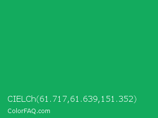 CIELCh 61.717,61.639,151.352 Color is a normal green color and the nearest color is GO Green #00ab66. Hex code #13ab5e and RGB value is rgb(19,171,94). In RGB color space, this color is composed of 7% red, 67% green, 37% blue, In CMYK color space, this color is composed of 89% cyan, 0% magenta, 45% yellow , 33% black , In HSL color space, this color has a hue angle of 150° , 80% saturation and 37% lightness.
