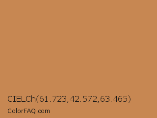 CIELCh 61.723,42.572,63.465 Color is a normal orange color and the nearest color is Deer #ba8759. Hex code #c78752 and RGB value is rgb(199,135,82). In RGB color space, this color is composed of 78% red, 53% green, 32% blue, In CMYK color space, this color is composed of 0% cyan, 32% magenta, 59% yellow , 22% black , In HSL color space, this color has a hue angle of 27° , 51% saturation and 55% lightness.