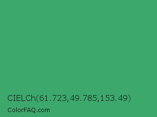 CIELCh 61.723,49.785,153.49 Color is a normal green color and the nearest color is Medium Sea Green #3cb371. Hex code #3da86c and RGB value is rgb(61,168,108). In RGB color space, this color is composed of 24% red, 66% green, 42% blue, In CMYK color space, this color is composed of 64% cyan, 0% magenta, 36% yellow , 34% black , In HSL color space, this color has a hue angle of 146° , 47% saturation and 45% lightness.