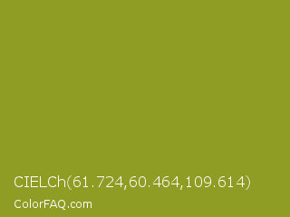 CIELCh 61.724,60.464,109.614 Color is a normal yellow color and the nearest color is Citron #9fa91f. Hex code #8f9d24 and RGB value is rgb(143,157,36). In RGB color space, this color is composed of 56% red, 62% green, 14% blue, In CMYK color space, this color is composed of 9% cyan, 0% magenta, 77% yellow , 38% black , In HSL color space, this color has a hue angle of 67° , 63% saturation and 38% lightness.