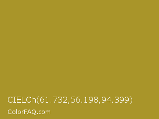 CIELCh 61.732,56.198,94.399 Color is a normal yellow color and the nearest color is Alpine #af8f2c. Hex code #a99529 and RGB value is rgb(169,149,41). In RGB color space, this color is composed of 66% red, 58% green, 16% blue, In CMYK color space, this color is composed of 0% cyan, 12% magenta, 76% yellow , 34% black , In HSL color space, this color has a hue angle of 51° , 61% saturation and 41% lightness.