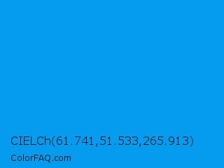 CIELCh 61.741,51.533,265.913 Color is a normal blue color and the nearest color is Vivid Cerulean #00aaee. Hex code #059cf0 and RGB value is rgb(5,156,240). In RGB color space, this color is composed of 2% red, 61% green, 94% blue, In CMYK color space, this color is composed of 98% cyan, 35% magenta, 0% yellow , 6% black , In HSL color space, this color has a hue angle of 201° , 96% saturation and 48% lightness.