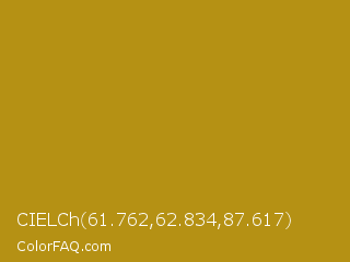 CIELCh 61.762,62.834,87.617 Color is a normal yellow color and the nearest color is Dark Goldenrod #b8860b. Hex code #b59114 and RGB value is rgb(181,145,20). In RGB color space, this color is composed of 71% red, 57% green, 8% blue, In CMYK color space, this color is composed of 0% cyan, 20% magenta, 89% yellow , 29% black , In HSL color space, this color has a hue angle of 47° , 80% saturation and 39% lightness.