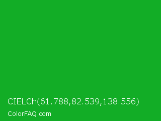 CIELCh 61.788,82.539,138.556 Color is a normal green color and the nearest color is Dark Pastel Green #03c03c. Hex code #12ad26 and RGB value is rgb(18,173,38). In RGB color space, this color is composed of 7% red, 68% green, 15% blue, In CMYK color space, this color is composed of 90% cyan, 0% magenta, 78% yellow , 32% black , In HSL color space, this color has a hue angle of 128° , 81% saturation and 37% lightness.