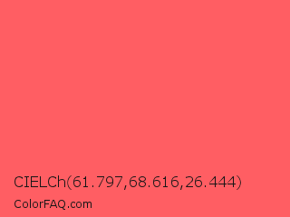 CIELCh 61.797,68.616,26.444 Color is a light red color and the nearest color is Carnation #f95a61. Hex code #ff5e63 and RGB value is rgb(255,94,99). In RGB color space, this color is composed of 100% red, 37% green, 39% blue, In CMYK color space, this color is composed of 0% cyan, 63% magenta, 61% yellow , 0% black , In HSL color space, this color has a hue angle of 358° , 100% saturation and 68% lightness.