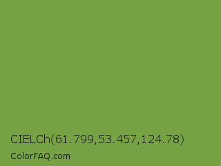 CIELCh 61.799,53.457,124.78 Color is a normal green color and the nearest color is Palm Leaf #6f9940. Hex code #77a243 and RGB value is rgb(119,162,67). In RGB color space, this color is composed of 47% red, 64% green, 26% blue, In CMYK color space, this color is composed of 27% cyan, 0% magenta, 59% yellow , 36% black , In HSL color space, this color has a hue angle of 87° , 41% saturation and 45% lightness.
