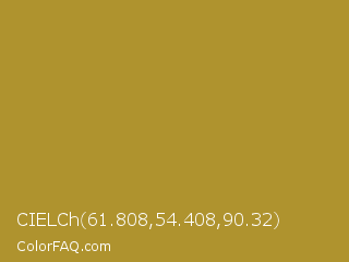 CIELCh 61.808,54.408,90.32 Color is a normal yellow color and the nearest color is Alpine #af8f2c. Hex code #af932e and RGB value is rgb(175,147,46). In RGB color space, this color is composed of 69% red, 58% green, 18% blue, In CMYK color space, this color is composed of 0% cyan, 16% magenta, 74% yellow , 31% black , In HSL color space, this color has a hue angle of 47° , 58% saturation and 43% lightness.