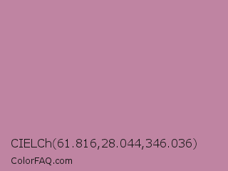CIELCh 61.816,28.044,346.036 Color is a light rose color and the nearest color is Opera Mauve #b784a7. Hex code #bf84a2 and RGB value is rgb(191,132,162). In RGB color space, this color is composed of 75% red, 52% green, 64% blue, In CMYK color space, this color is composed of 0% cyan, 31% magenta, 15% yellow , 25% black , In HSL color space, this color has a hue angle of 329° , 32% saturation and 63% lightness.