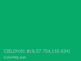 CIELCh 61.819,57.754,155.634 Color is a normal green color and the nearest color is GO Green #00ab66. Hex code #07ab69 and RGB value is rgb(7,171,105). In RGB color space, this color is composed of 3% red, 67% green, 41% blue, In CMYK color space, this color is composed of 96% cyan, 0% magenta, 39% yellow , 33% black , In HSL color space, this color has a hue angle of 156° , 92% saturation and 35% lightness.