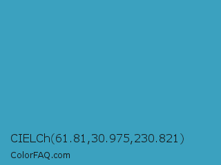 CIELCh 61.81,30.975,230.821 Color is a normal blue color and the nearest color is Pelorous #3eabbf. Hex code #3ba1bf and RGB value is rgb(59,161,191). In RGB color space, this color is composed of 23% red, 63% green, 75% blue, In CMYK color space, this color is composed of 69% cyan, 16% magenta, 0% yellow , 25% black , In HSL color space, this color has a hue angle of 194° , 53% saturation and 49% lightness.