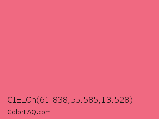 CIELCh 61.838,55.585,13.528 Color is a light red color and the nearest color is Ultra Red #fc6c85. Hex code #f06981 and RGB value is rgb(240,105,129). In RGB color space, this color is composed of 94% red, 41% green, 51% blue, In CMYK color space, this color is composed of 0% cyan, 56% magenta, 46% yellow , 6% black , In HSL color space, this color has a hue angle of 349° , 82% saturation and 68% lightness.
