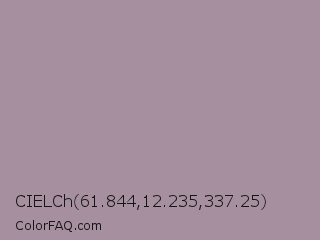 CIELCh 61.844,12.235,337.25 Color is a light magenta color and the nearest color is Dusty Gray #a8989b. Hex code #a68f9e and RGB value is rgb(166,143,158). In RGB color space, this color is composed of 65% red, 56% green, 62% blue, In CMYK color space, this color is composed of 0% cyan, 14% magenta, 5% yellow , 35% black , In HSL color space, this color has a hue angle of 321° , 11% saturation and 61% lightness.