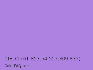 CIELCh 61.853,54.517,309.835 Color is a light violet color and the nearest color is Lavender #b57edc. Hex code #ad82e0 and RGB value is rgb(173,130,224). In RGB color space, this color is composed of 68% red, 51% green, 88% blue, In CMYK color space, this color is composed of 23% cyan, 42% magenta, 0% yellow , 12% black , In HSL color space, this color has a hue angle of 267° , 60% saturation and 69% lightness.