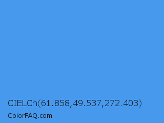 CIELCh 61.858,49.537,272.403 Color is a normal blue color and the nearest color is Tufts Blue #3e8ede. Hex code #4799ed and RGB value is rgb(71,153,237). In RGB color space, this color is composed of 28% red, 60% green, 93% blue, In CMYK color space, this color is composed of 70% cyan, 35% magenta, 0% yellow , 7% black , In HSL color space, this color has a hue angle of 210° , 82% saturation and 60% lightness.