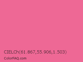 CIELCh 61.867,55.906,1.503 Color is a light rose color and the nearest color is Light Crimson #f56991. Hex code #ee6895 and RGB value is rgb(238,104,149). In RGB color space, this color is composed of 93% red, 41% green, 58% blue, In CMYK color space, this color is composed of 0% cyan, 56% magenta, 37% yellow , 7% black , In HSL color space, this color has a hue angle of 340° , 80% saturation and 67% lightness.