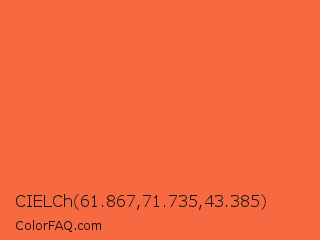 CIELCh 61.867,71.735,43.385 Color is a light red color and the nearest color is Smashed Pumpkin #ff6d3a. Hex code #f76940 and RGB value is rgb(247,105,64). In RGB color space, this color is composed of 97% red, 41% green, 25% blue, In CMYK color space, this color is composed of 0% cyan, 57% magenta, 74% yellow , 3% black , In HSL color space, this color has a hue angle of 13° , 92% saturation and 61% lightness.