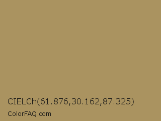 CIELCh 61.876,30.162,87.325 Color is a normal orange color and the nearest color is Teak #b19461. Hex code #aa9360 and RGB value is rgb(170,147,96). In RGB color space, this color is composed of 67% red, 58% green, 38% blue, In CMYK color space, this color is composed of 0% cyan, 14% magenta, 44% yellow , 33% black , In HSL color space, this color has a hue angle of 41° , 30% saturation and 52% lightness.
