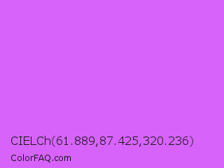 CIELCh 61.889,87.425,320.236 Color is a light purple color and the nearest color is Heliotrope #df73ff. Hex code #d763fa and RGB value is rgb(215,99,250). In RGB color space, this color is composed of 84% red, 39% green, 98% blue, In CMYK color space, this color is composed of 14% cyan, 60% magenta, 0% yellow , 2% black , In HSL color space, this color has a hue angle of 286° , 94% saturation and 68% lightness.