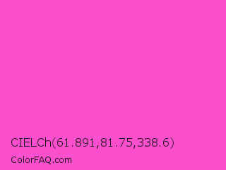 CIELCh 61.891,81.75,338.6 Color is a light magenta color and the nearest color is Light Deep Pink #ff5ccd. Hex code #fa4fcc and RGB value is rgb(250,79,204). In RGB color space, this color is composed of 98% red, 31% green, 80% blue, In CMYK color space, this color is composed of 0% cyan, 68% magenta, 18% yellow , 2% black , In HSL color space, this color has a hue angle of 316° , 94% saturation and 65% lightness.