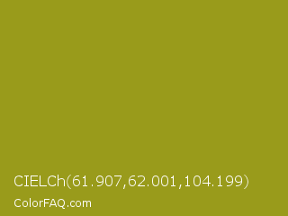 CIELCh 61.907,62.001,104.199 Color is a normal yellow color and the nearest color is Citron #9fa91f. Hex code #999b1b and RGB value is rgb(153,155,27). In RGB color space, this color is composed of 60% red, 61% green, 11% blue, In CMYK color space, this color is composed of 1% cyan, 0% magenta, 83% yellow , 39% black , In HSL color space, this color has a hue angle of 61° , 70% saturation and 36% lightness.