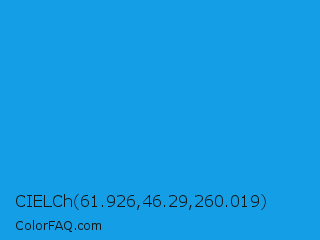 CIELCh 61.926,46.29,260.019 Color is a normal blue color and the nearest color is Button Blue #24a0ed. Hex code #149ee6 and RGB value is rgb(20,158,230). In RGB color space, this color is composed of 8% red, 62% green, 90% blue, In CMYK color space, this color is composed of 91% cyan, 31% magenta, 0% yellow , 10% black , In HSL color space, this color has a hue angle of 201° , 84% saturation and 49% lightness.