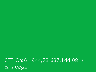 CIELCh 61.944,73.637,144.081 Color is a normal green color and the nearest color is Green Pantone #00ad43. Hex code #07ad43 and RGB value is rgb(7,173,67). In RGB color space, this color is composed of 3% red, 68% green, 26% blue, In CMYK color space, this color is composed of 96% cyan, 0% magenta, 61% yellow , 32% black , In HSL color space, this color has a hue angle of 142° , 92% saturation and 35% lightness.
