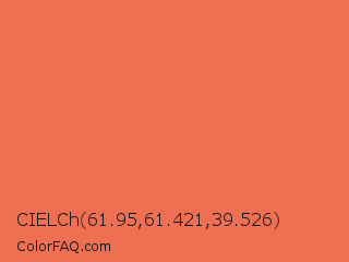 CIELCh 61.95,61.421,39.526 Color is a light red color and the nearest color is Burnt Sienna #e97451. Hex code #ef6f53 and RGB value is rgb(239,111,83). In RGB color space, this color is composed of 94% red, 44% green, 33% blue, In CMYK color space, this color is composed of 0% cyan, 54% magenta, 65% yellow , 6% black , In HSL color space, this color has a hue angle of 11° , 83% saturation and 63% lightness.