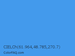 CIELCh 61.964,48.785,270.7 Color is a normal blue color and the nearest color is Tufts Blue #3e8ede. Hex code #439aec and RGB value is rgb(67,154,236). In RGB color space, this color is composed of 26% red, 60% green, 93% blue, In CMYK color space, this color is composed of 72% cyan, 35% magenta, 0% yellow , 7% black , In HSL color space, this color has a hue angle of 209° , 82% saturation and 59% lightness.