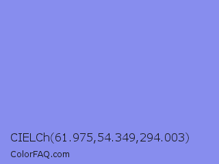 CIELCh 61.975,54.349,294.003 Color is a light blue color and the nearest color is Portage #8b9fee. Hex code #878dee and RGB value is rgb(135,141,238). In RGB color space, this color is composed of 53% red, 55% green, 93% blue, In CMYK color space, this color is composed of 43% cyan, 41% magenta, 0% yellow , 7% black , In HSL color space, this color has a hue angle of 237° , 75% saturation and 73% lightness.
