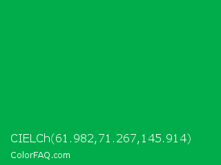 CIELCh 61.982,71.267,145.914 Color is a normal green color and the nearest color is Green Pantone #00ad43. Hex code #00ad4a and RGB value is rgb(0,173,74). In RGB color space, this color is composed of 0% red, 68% green, 29% blue, In CMYK color space, this color is composed of 100% cyan, 0% magenta, 57% yellow , 32% black , In HSL color space, this color has a hue angle of 146° , 100% saturation and 34% lightness.