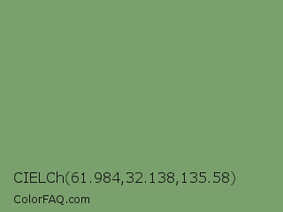 CIELCh 61.984,32.138,135.58 Color is a normal green color and the nearest color is Asparagus #87a96b. Hex code #7aa06d and RGB value is rgb(122,160,109). In RGB color space, this color is composed of 48% red, 63% green, 43% blue, In CMYK color space, this color is composed of 24% cyan, 0% magenta, 32% yellow , 37% black , In HSL color space, this color has a hue angle of 105° , 21% saturation and 53% lightness.