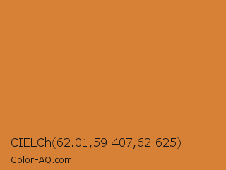 CIELCh 62.01,59.407,62.625 Color is a normal orange color and the nearest color is Bronze #cd7f32. Hex code #d78136 and RGB value is rgb(215,129,54). In RGB color space, this color is composed of 84% red, 51% green, 21% blue, In CMYK color space, this color is composed of 0% cyan, 40% magenta, 75% yellow , 16% black , In HSL color space, this color has a hue angle of 28° , 67% saturation and 53% lightness.