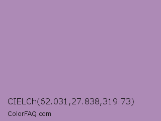 CIELCh 62.031,27.838,319.73 Color is a light purple color and the nearest color is Glossy Grape #ab92b3. Hex code #ad8ab6 and RGB value is rgb(173,138,182). In RGB color space, this color is composed of 68% red, 54% green, 71% blue, In CMYK color space, this color is composed of 5% cyan, 24% magenta, 0% yellow , 29% black , In HSL color space, this color has a hue angle of 288° , 23% saturation and 63% lightness.