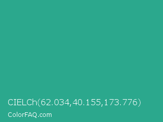 CIELCh 62.034,40.155,173.776 Color is a normal cyan color and the nearest color is Jungle Green #29ab87. Hex code #2ba88d and RGB value is rgb(43,168,141). In RGB color space, this color is composed of 17% red, 66% green, 55% blue, In CMYK color space, this color is composed of 74% cyan, 0% magenta, 16% yellow , 34% black , In HSL color space, this color has a hue angle of 167° , 59% saturation and 41% lightness.