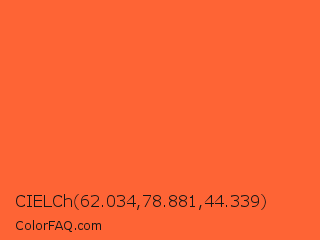 CIELCh 62.034,78.881,44.339 Color is a normal red color and the nearest color is Outrageous Orange Crayola #ff6037. Hex code #fe6435 and RGB value is rgb(254,100,53). In RGB color space, this color is composed of 100% red, 39% green, 21% blue, In CMYK color space, this color is composed of 0% cyan, 61% magenta, 79% yellow , 0% black , In HSL color space, this color has a hue angle of 14° , 99% saturation and 60% lightness.