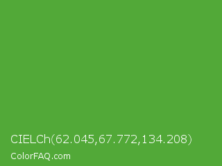 CIELCh 62.045,67.772,134.208 Color is a normal green color and the nearest color is Apple #4fa83d. Hex code #52a938 and RGB value is rgb(82,169,56). In RGB color space, this color is composed of 32% red, 66% green, 22% blue, In CMYK color space, this color is composed of 51% cyan, 0% magenta, 67% yellow , 34% black , In HSL color space, this color has a hue angle of 106° , 50% saturation and 44% lightness.