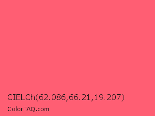 CIELCh 62.086,66.21,19.207 Color is a light red color and the nearest color is Wild Watermelon #fd5b78. Hex code #ff5e73 and RGB value is rgb(255,94,115). In RGB color space, this color is composed of 100% red, 37% green, 45% blue, In CMYK color space, this color is composed of 0% cyan, 63% magenta, 55% yellow , 0% black , In HSL color space, this color has a hue angle of 352° , 100% saturation and 68% lightness.