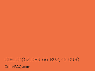 CIELCh 62.089,66.892,46.093 Color is a normal orange color and the nearest color is Mandarin #f37a48. Hex code #f07042 and RGB value is rgb(240,112,66). In RGB color space, this color is composed of 94% red, 44% green, 26% blue, In CMYK color space, this color is composed of 0% cyan, 53% magenta, 73% yellow , 6% black , In HSL color space, this color has a hue angle of 16° , 85% saturation and 60% lightness.