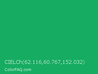 CIELCh 62.116,60.767,152.032 Color is a normal green color and the nearest color is GO Green #00ab66. Hex code #16ac61 and RGB value is rgb(22,172,97). In RGB color space, this color is composed of 9% red, 67% green, 38% blue, In CMYK color space, this color is composed of 87% cyan, 0% magenta, 44% yellow , 33% black , In HSL color space, this color has a hue angle of 150° , 77% saturation and 38% lightness.