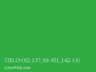 CIELCh 62.137,69.451,142.14 Color is a normal green color and the nearest color is Wageningen Green #34b233. Hex code #30ac45 and RGB value is rgb(48,172,69). In RGB color space, this color is composed of 19% red, 67% green, 27% blue, In CMYK color space, this color is composed of 72% cyan, 0% magenta, 60% yellow , 33% black , In HSL color space, this color has a hue angle of 130° , 56% saturation and 43% lightness.