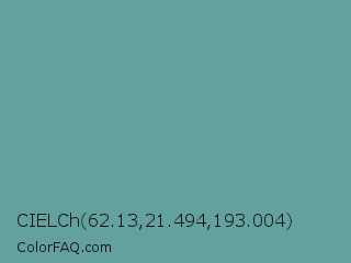 CIELCh 62.13,21.494,193.004 Color is a normal cyan color and the nearest color is Cadet Blue #5f9ea0. Hex code #62a19e and RGB value is rgb(98,161,158). In RGB color space, this color is composed of 38% red, 63% green, 62% blue, In CMYK color space, this color is composed of 39% cyan, 0% magenta, 2% yellow , 37% black , In HSL color space, this color has a hue angle of 177° , 25% saturation and 51% lightness.
