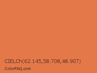 CIELCh 62.145,58.708,48.907 Color is a normal orange color and the nearest color is Burnt Sienna #e97451. Hex code #e57849 and RGB value is rgb(229,120,73). In RGB color space, this color is composed of 90% red, 47% green, 29% blue, In CMYK color space, this color is composed of 0% cyan, 48% magenta, 68% yellow , 10% black , In HSL color space, this color has a hue angle of 18° , 75% saturation and 59% lightness.
