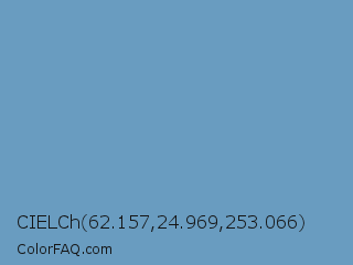 CIELCh 62.157,24.969,253.066 Color is a normal blue color and the nearest color is Cerulean Frost #6d9bc3. Hex code #699cc0 and RGB value is rgb(105,156,192). In RGB color space, this color is composed of 41% red, 61% green, 75% blue, In CMYK color space, this color is composed of 45% cyan, 19% magenta, 0% yellow , 25% black , In HSL color space, this color has a hue angle of 205° , 41% saturation and 58% lightness.
