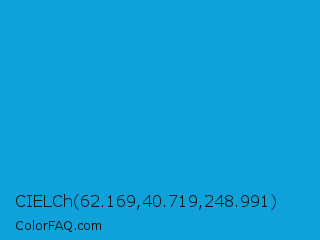CIELCh 62.169,40.719,248.991 Color is a normal blue color and the nearest color is Cerulean #02a4d3. Hex code #0fa1d9 and RGB value is rgb(15,161,217). In RGB color space, this color is composed of 6% red, 63% green, 85% blue, In CMYK color space, this color is composed of 93% cyan, 26% magenta, 0% yellow , 15% black , In HSL color space, this color has a hue angle of 197° , 87% saturation and 45% lightness.